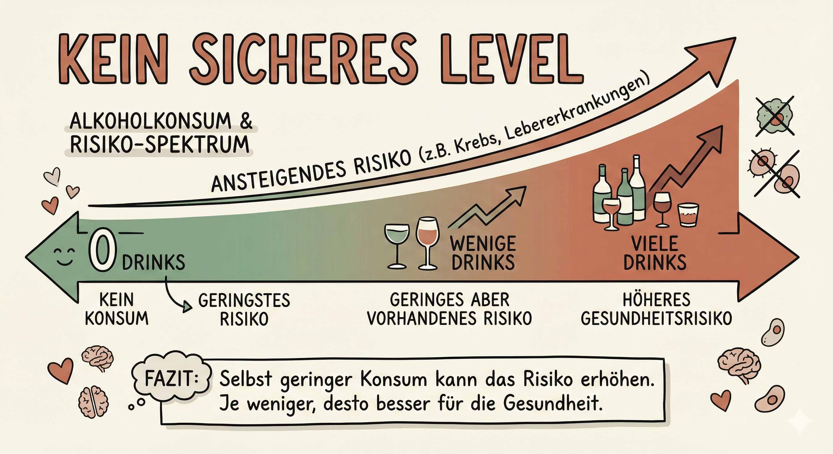 Die kanadischen Richtlinien von 2023 – international als fortschrittlichstes Modell anerkannt – empfehlen ein Risikokontinuum: 0 Drinks für maximale Gesundheit, maximal 2 pro Woche zur Risikominimierung.