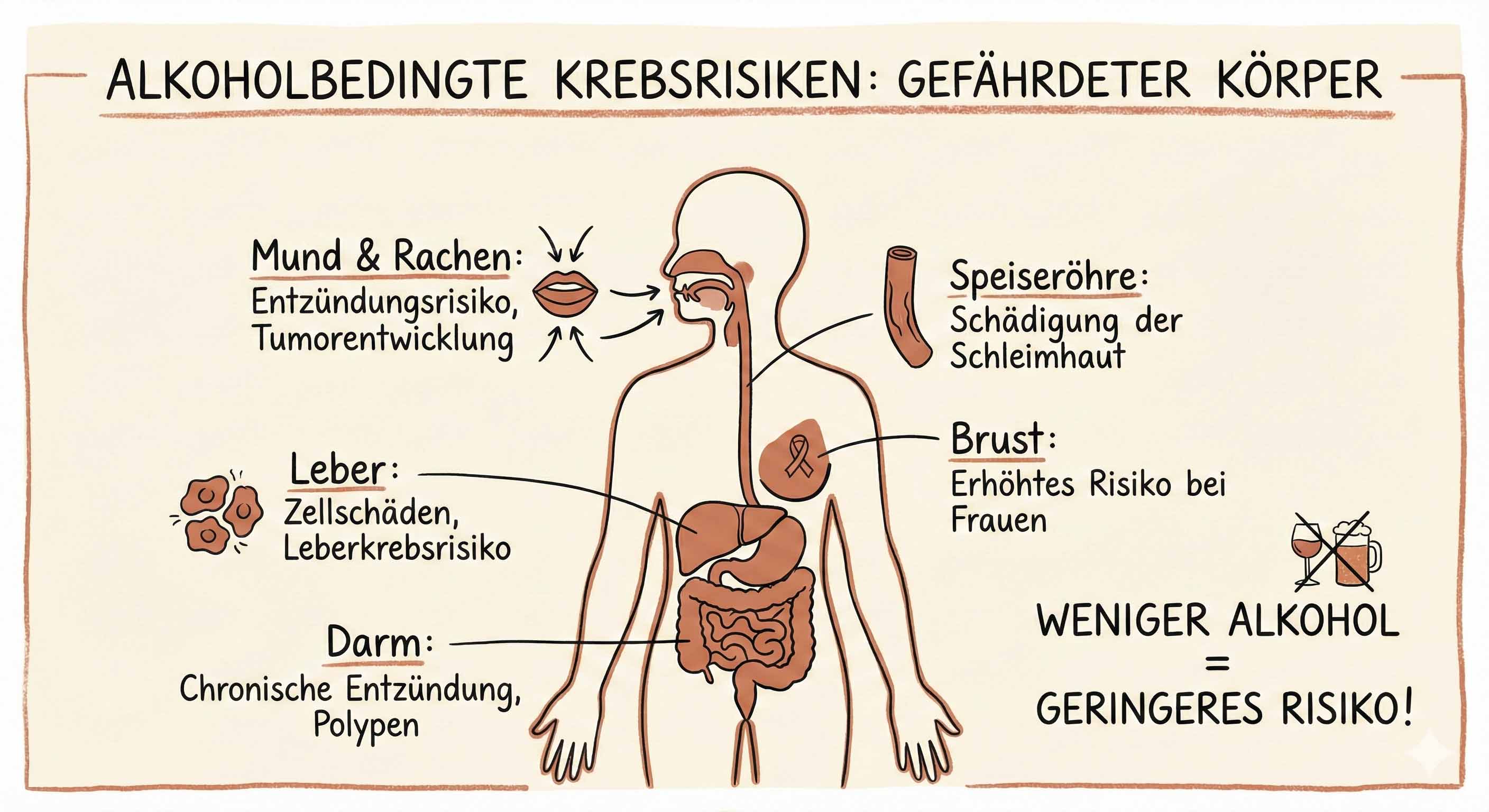 Brustkrebs: Für Frauen ist das die häufigste alkoholbedingte Krebsart. Schon ein Glas pro Tag erhöht das Risiko um etwa 10 %. Alkohol steigert den Östrogenspiegel – und Östrogen kann Tumorwachstum fördern.